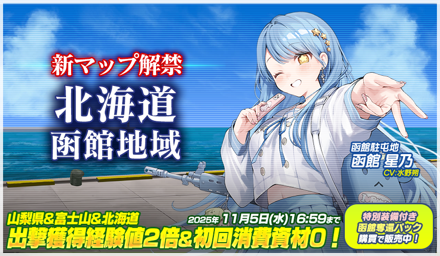 ▼山梨県/富士山/北海道での出撃獲得経験値2倍&初回出撃時の消費資材0!