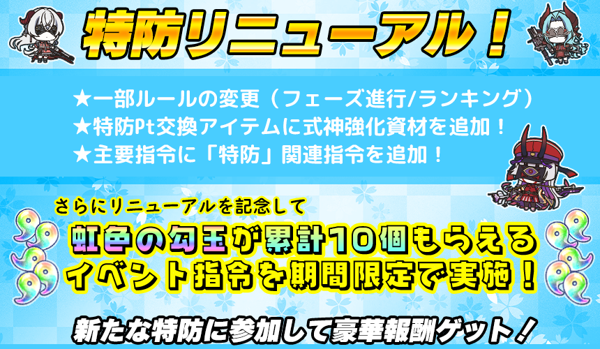 特防のリニューアルを記念して、最大10個の虹色の勾玉が貰える期間限定イベント指令を実施!